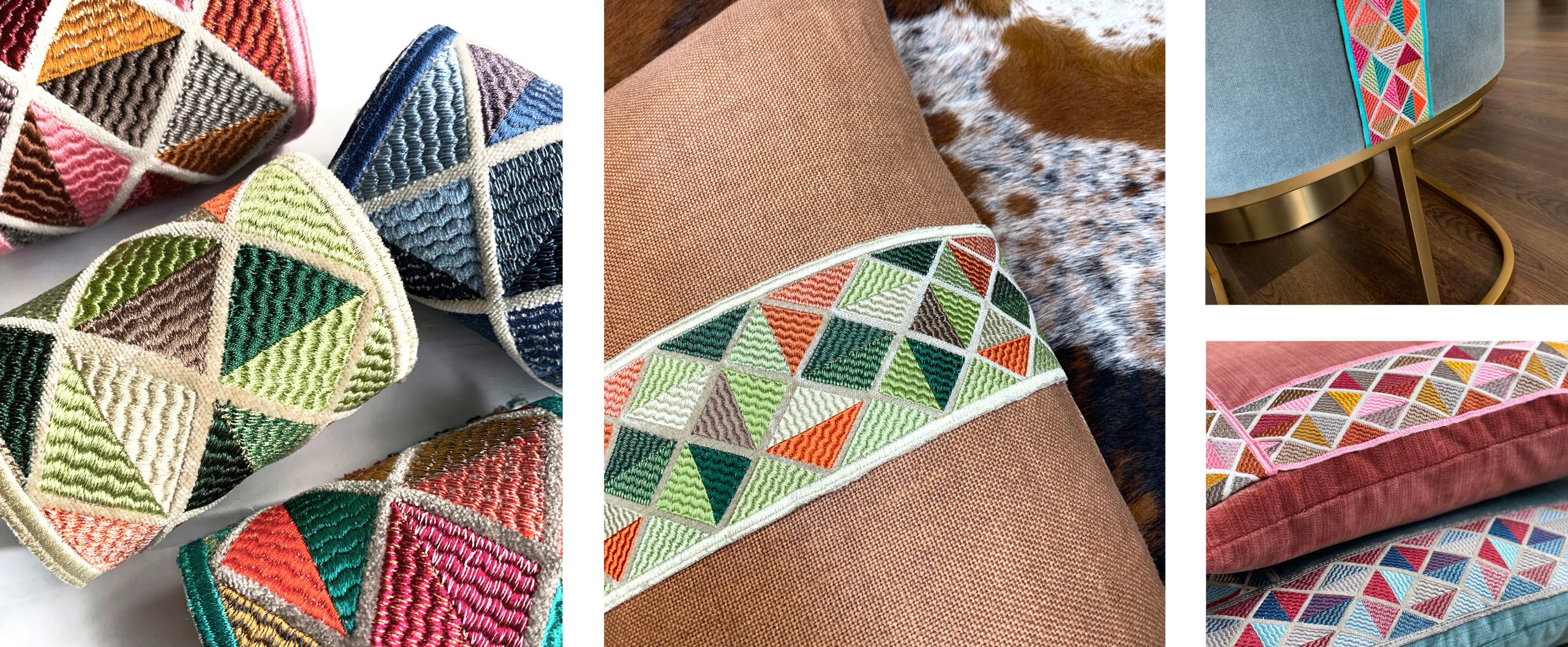 Build character with these vivacious tapes packed with detail! The modern diamond pattern is filled with wavy knitted centers in energetic color combinations to make a statement in any room. Pop them on pillows, window treatments and furniture for a cheerful addition. Tape width: 3 1/2”